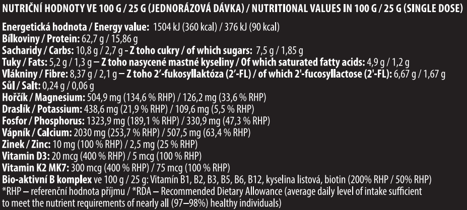 Zloženie: natívny kozí mliečny proteín, 2'-fukosyllaktóza (2'-FL), MCT prášok (triglyceridy so stredne dlhým reťazcom), cejlónska škorica mletá (3%), bisglycinát horečnatý, mletá vanilka bourbon cholekalciferol, bioaktívny b-komplex (niacinamid, pantothenát vápenatý, riboflavín-5-fosfát, pyridoxal-5-fosfát, tiamín hydrochlorid, folát z Quatrefolic® [(6S)-5-metylkotramínofolát], biotín,